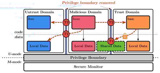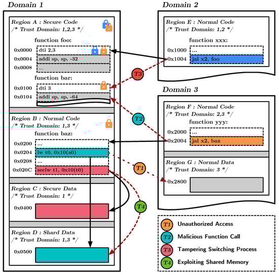 Memory isolation that does not support multiple unprivileged domains can prevent this unauthorized access using privilege-level software. This software is always performed when switching domains, configuring the new memory access scope on the MPU, and validating legitimate access. However, as we support unprivileged domains that remove the overhead of privilege-level intervention in these processes, some threats need to be considered. Figure 1 illustrates the threats in the unprivileged domain, which arise from removing privilege boundaries, denoted as T1, T2, T3, and T4, described below.