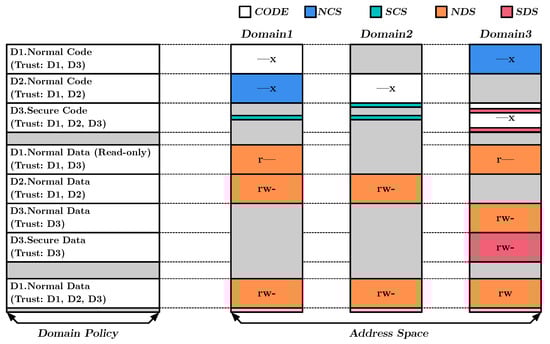 The protection strategy in DEMIX is based on the domain policy, which assigns an access protection strategy to each memory segment. The policy ensures that access to memory segments is only granted to authorized domains and provides a more elevated level of security in the system. The protection strategy is mainly differentiated by whether a memory segment is code or data and whether its protection level is normal or secure. The protection level supports granting access to highly distributed memory regions through instruction-level domain isolation techniques, which enables the creation of fine-grained, highly distributed permissions within the instruction unit. Figure 3 illustrates the memory protection functionality in DEMIX. As shown, each segment in the DEMIX’s address space can be shared among different domains through trust configuration or have extra privileges granted through intra-domain isolation at the instruction level. This section provides more information on the memory protection functionality of each segment under these configurations.