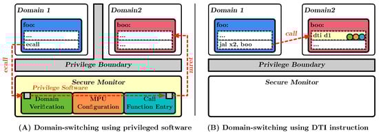 The Memory Protection Unit (MPU) [24,25], one of the most popular techniques to provide memory isolation by domain in embedded systems, is commonly implemented as a dedicated hardware component and manages memory access permissions and restrictions. However, this method comes with the drawback of overheads when switching domains. Specifically, the cost of switching privilege levels incurs as MPUs can only be configured in the privileged mode for domain protection. Additionally, the cost of reconfiguring the MPU is also incurred during domain switching. These overheads can be significant for applications that frequently change domains.