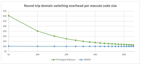 DEMIX reduces the overhead of switching domains by minimizing the process, which is particularly advantageous when the amount of executed code is small after switching. The fbctl function in the BEEPS Benchmark takes 8893 cycles when executed via privilege-based domain switching but 8710 cycles when using DEMIX. However, for functions with short internal execution, such as crc32, the reduced overhead using DEMIX is significant at 98 cycles compared to 287 cycles when executed via privilege-based domain switching. Note that due to the separation of the timer domain and the benchmark execution domain, a round-trip switching overhead is added. Figure 6 presents the roundtrip switching overhead per code size. In other words, it compares the execution time of DEMIX with switching via privileged software as a function of the code size being executed relative to a normal function call. As shown, DEMIX incurs nearly the same execution time irrespective of the code size, whereas the overhead increases with the number of smaller code sizes when privileged software is involved.