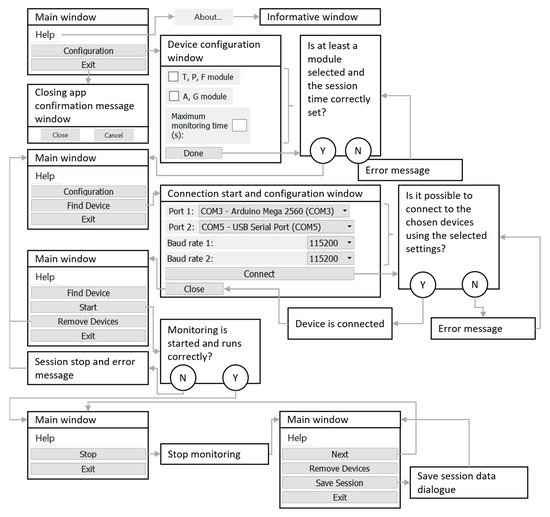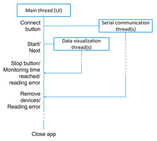 When developing a GUI, it must be considered that users should have permanent access to the open windows’ active functions. This becomes critical when computationally intensive tasks simultaneously need to be executed. This is the case with the application described in this work, in which it is important to assure data visualization with real-time graphs, GUI responsiveness, and communication with the data acquisition modules. Parallel computing was used to allow it, through multithreading, as represented in Figure 5. Four thread types were created using pyqt5’s Qthread class, with the main one being relative to the graphical GUI. The second and third were created for connection and communication with data acquisition modules. The las thread type was developed for updating the graphs with the data being received. Communication between threads is implemented through signals leading to the execution of specific functions.