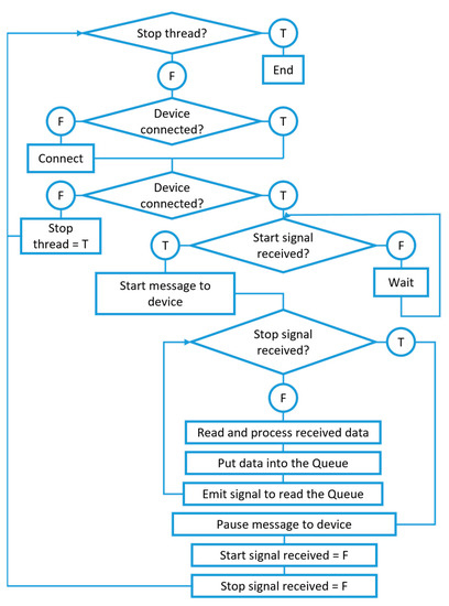 Data acquisition modules communication was implemented through the pyserial library, with Figure 6 showing a schematic representation of the code used to do so. As defined in the Firmware Subsection, once the devices are successfully connected, as soon as the start signal is received by the thread, the character for sensor reading initiation is emitted. A timer is initiated and used for registering the time when each new set of data is received. Data is received as a character comma-separated string of sensor reading values, which, after being separated and associated with their timestamp, are put into a queue, method used to transfer data to the graph-allocated threads. A signal for reading these data is sent next.