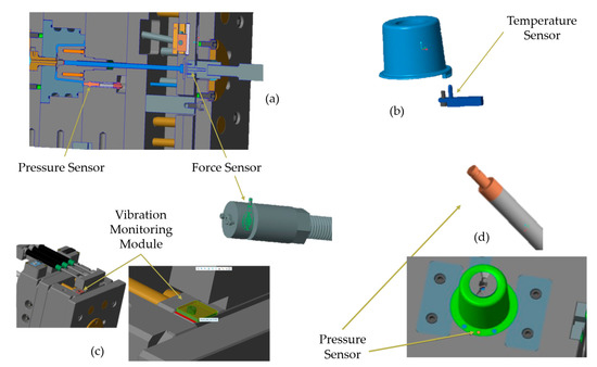 Detailed view of the CAD models representing the injected part, sensors, and their installation positions. (a) Section view of the mold with pressure and force sensors placement, and force sensor installation detail; (b) Injected part 3D model and relative temperature sensor position; (c) Vibration monitoring module position; (d) Pressure sensor 3D model and its position relative to the part.