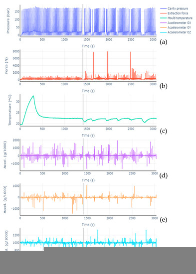A better direct comparison between normal and faulty operation cycles is given by Figure 11. On it, data from the cavity pressure sensor (Figure 11a), force sensor (Figure 11b), vibration (acceleration in the OX axis, Figure 11c, OY, Figure 11d, and OZ, Figure 11e), can be viewed, with the injection cycles overlapped and identified as blue for normal operation and red for simulated fault operation. Regarding cavity pressure data, it is possible to observe a regular operation cycle that does not align with the remaining ones. This is due to the longer time taken by the operator to start the first run, after the mold was closed. The remaining cycles, however, do align, both in regular and simulated fault operation. Moreover, attesting the system’s capability to acquire useful data in the scope of general injection molding process monitoring, and not only for predictive maintenance, the pressure curves allow a clear identification of the distinct process phases. More specifically, the registered curves are consistent with the general shape presented in [21], being characterized by a steep increase in cavity pressure during the filling phase, after which the maximum pressure is reached. It is then followed by the packing or holding phase during which cavity pressure registers a plateau slightly under peak pressure that is kept until the polymer freezes at the gate. With the gate closed, pressure drops until it reaches a lower plateau, with only residual pressure while the part finishes cooling. At the end of this phase, the mold opens and the part is extracted. The ejection phase can also be easily identified in Figure 11, as it is characterized by the drop in cavity pressure to atmospheric pressure, the peaks in the force values, and the most significant vibrations seen in the acceleration graphs. As observed before in Figure 10, Figure 11 shows clear differences in force amplitude reached in the cycles affected by the simulated fault. Additionally, cycles in which part extraction took longer than normal can be identified and coincide with the extraction pin initially jamming due to the added friction. The data collected from the 3D accelerometer could be used to identify and monitor different machinery movements and respective process phases, similar to the results presented by Moreira et al. [8] and Brunthaler et al. [22]. As broadly verified in those works, the most noticeable vibrations in amplitude, and with a significant duration, were observed for the part ejection phase. Mold closing is identifiable, in the case of this work, at the beginning of the cycles and near the 25 s mark, the latter being more obvious in the OZ acceleration graph. Data displayed after the 25 s mark corresponds to cycles with a longer pause associated with them, or to cycles that required a longer extraction phase due to the introduced fault. Mold opening vibrations can be seen in the graph at 20 s. There are three small disturbances that can be viewed in the acceleration graphs and that are common between the different acceleration directions and multiple cycles. The first may correspond to the screw advancing before the filling phase start, the second to the gate freezing and the third to the screw being retracted. Differences in acceleration components’ amplitudes and time for stabilization can also be observed. This demonstrates the usefulness and viability of the developed monitoring system and similar proposals. The remaining sensors did not show any clear difference between normal operation and otherwise, thus the emphasis on vibrations and force sensors.