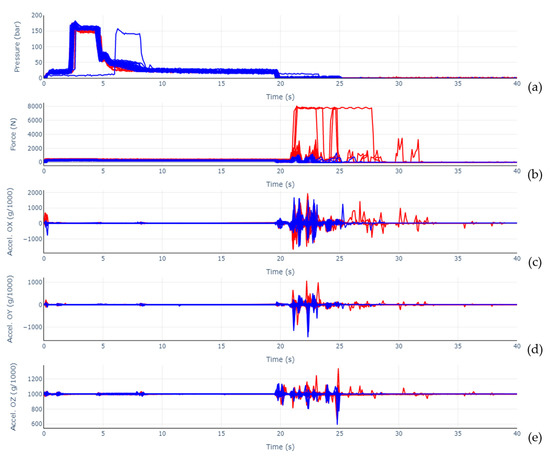 Sensor data for each cycle, overlapped and colored in blue for the regular operation scenario and in red for the simulated fault operation scenario. (a)—Pressure sensor, (b)—Force sensor, (c)—Accelerometer (OX axis), (d)—Accelerometer (OY axis), (e)—Accelerometer (OZ axis).
