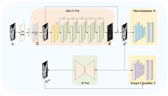 However, the above algorithms based on iterative optimization generally suffer from high computational cost and slow running speed. In recent years, with the development of generative adversarial networks (GAN) [25], the generation of adversarial samples has become more diverse. Based on GAN, Xiao et al. [26] proposed a fast adversarial perturbation generation method called AdvGAN. The generator G takes the original image x as the input and outputs the adversarial perturbation G(x). Then, the perturbation is superimposed on the original image to obtain the adversarial sample x + G(x). The mutual game between the discriminator and the generator drives the visual similarity of the adversarial samples and the original images. Since this scheme does not require iterative optimization and generates the adversarial sample in a single forward pass at the inference stage, it significantly improves the generation speed of the adversarial sample while guaranteeing the success rate of the attack and the image quality. AdvGAN++ [27], based on AdvGAN, proposes to make full use of the potential features of the original image to generate adversarial samples. In this paper, the adversarial reconstructed image is an adversarial sample generated by the generation-based method.