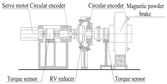 In this study, the factor-error data were obtained directly from the RV reducer production and processing facility to ensure the practicality of the rotation error prediction model and sensitivity analysis results. Each reducer’s rotation error is measured using a dedicated RV reducer rotation error test bench, and the deviation of each influencing factor is measured using the double cylindric rod measuring method, the common normal line method, and other technologies. Figure 2 depicts the schematic diagram of the rotation error test bench. The servo motor can be set to rotate at different speeds, the magnetic powder brake can be used to apply different loads. Two circular encoders record the angular signals at the input and output of the reducer; using the phase difference information of the angular signals, calculate the rotation error of the reducer.