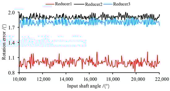 When testing each reducer, the test bench is configured with the same speed and load, the rotation error data of each RV reducer in the stable operation is recorded, and the average value is considered the rotation error value. Adjust the servo motor speed to 1200 rpm, set the load bit to 200 N·m, record the rotation error after the reducer has stabilized, and select at random the test curve chart for three reducers, as depicted in Figure 3. The sample point of the factor-rotation error is the sum of the value of the rotation error received from the test and the deviation of each influencing factor.