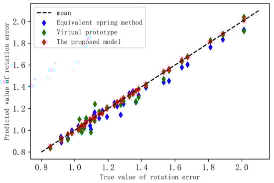 It can be seen from the Table 6 that the R2 value of the prediction model presented in this article reaches 96%. The model presented in this paper has stable mapping and high prediction accuracy, whereas the R2 value of the other two models is just over 75%. Figure 8 shows that the values predicted in this article are more in line with the true value, while the rotation error predicted by the other two models deviates from the measured values and are, in most cases, smaller than the measured values. Due to the fact that this paper is based on the actual production and processing plant data, the other two models may not account for the influence of the friction force and disregard the influence of certain components, such as the bearings, in the modeling process.