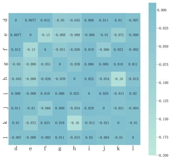 Figure 10 shows a heat map of the second-order sensitivity index between the variables affecting the rotation error of the RV reducer, with the labels of the rows and columns representing the same error factors as in Table 8. An increase in the thermogram readings or a darkening of the color of the two elements indicates that the coupling between the two components has a greater influence on the reducer’s rotation error. As shown in the picture, the second-order sensitivity index between (i) and (j) is 0.029, and the second-order sensitivity index between (i) and (h) is 0.025. These two coupling effects are noticeably stronger. The second-order sensitivity index between (d) and (e) is 0.0077, and the coupling effects between (d) and (e) have less of an impact on the rotation error. As the second-order sensitivity index between the other two components was either zero or negative, none of the coupling effects were significant. By comparing the first-order, second-order, and total effects of the factors influencing the rotation error, we can conclude that the total effects of each factor is produced by the combination of the main effects and the coupling between itself and the other influences.