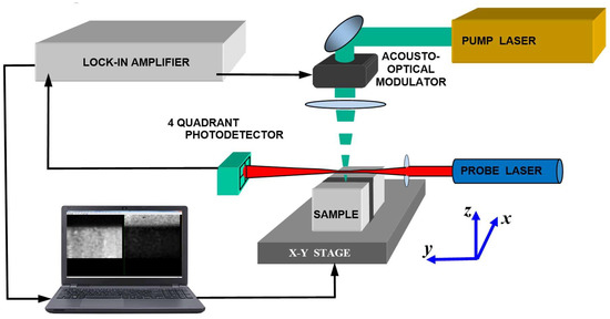 The common block scheme of the PBD experimental setup is presented in Figure 1. When the thermal waves are generated by the focused radiation of an Ar–ion laser or a solid-state laser operating at the wavelengths of 0.514 and 0.532 μm, correspondingly, the heat source can be considered as a surface one. The intensity of the pump laser radiation was modulated in time by an acousto-optic modulator in the range from 1 kHz to 10 kHz. The radiation intensity was small enough and made no changes in the objects under investigation. The radiation of a low-pointing-noise He–Ne laser serves as a probe beam. The spot size of the pump laser on the sample was no more than 5 micron for most experiments presented below. The minimum probe beam waist was about 25 micron. There are two possible modes of the PBD signal detection: normal and transverse, in accordance with the direction perpendicular or parallel to the surface, in which the probe-beam deflection is detected by a position-sensitive photodetector. In this review, we focused only on the normal PBD signal. A lock-in amplifier was used for measuring the output of the photodetector. Two-dimensional PBD images of the sample areas near the joint layer were formed by moving the sample in two directions by step motors. The PBD images were used to exclude from consideration the near surface areas with defects such as Kirkendal voids [51]. These subsurface cavities are invisible through an optical microscope, but they are well-identified by the photothermal microscopy. Cross sections of the photothermal images without defects, perpendicular to the plane of soldered contacts, were used for the analysis of thermal waves.