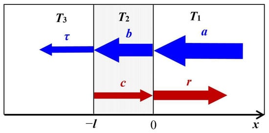 In the case of a constant heat flux, the TR depends only on the thermal properties of the intermediate layer between the contacting materials. In the case of unsteady heat fluxes, the TR of the contact may depend on the frequency. This situation can be illustrated by the example of the simplest structure shown in Figure 2. Using the concept of incident and reflected thermal waves and following the approach developed in [57,58], the alternative temperature components for three regions can be presented in the form of plane waves