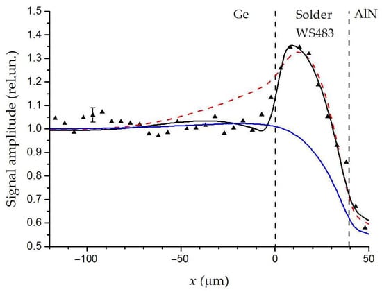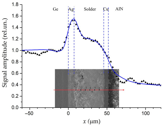 The averaged PBD-signal amplitude along the line in the SEM micrograph of area near the solder joint of the Ge−solder−AlN structure. Triangles are for experimental data. Blue curves are fitting. The element composition in the marked points on the red line is given in Table 1. Adapted with permission from [63]. Copyright (2019), Elsevier.