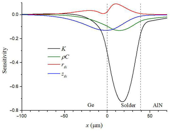Figure 4 shows the sensitivity to unknown thermal parameters of the joint calculated using Equation (11). It is seen that the sensitivity to K and sensitivity to ρC are closely correlated. This is because when the layer thickness is less than the thermal wave length, the temperature is mainly defined by the thermal effusivity, . Considering that the sensitivity to ρC is much less than to K, and the range of ρC for solids is narrower than the range of K, ρC was taken as a controlled parameter. The sensitivity graph shows that one can begin with fitting K as the first approximation. The sensitivity analysis allows reducing the region of the approximation. For example, when firstly fitting rth and zth, it can be limited to the segment [−30,30]. The obtained parameters can be used as a good starting point, which increases the reliability of the final results. The described algorithm made it possible to reduce the number of fitting parameters and the computation time.