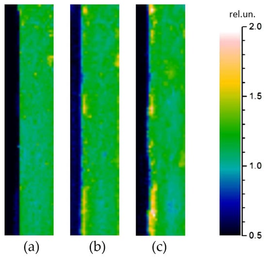 An example of studying the solder joint degradation with temperature is considered in Ref. [68]. Figure 6 presents the PBD images of an area near the solder joint between the Ge wafer and AlN in the initial state (Figure 6a) after one temperature cycle (Figure 6b) and after ten temperature cycles (Figure 6c). The temperature cycle is the immersion in liquid nitrogen for 10 s followed by waiting for 1 min. White spots correspond to an increase in the signal depending on the TR. The calculated average TR was equal to 7.7 × 10−7 m2K/W for the solder layer in the initial state and increased up to 2 × 10−6 and 5 × 10−6 m2K/W after the 1st and the 10th immersion, respectively.