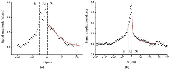 Amplitude of the PBD signal across a solder joint of two silicon diodes: (a) silicon wafers with ground surfaces; (b) silicon wafers with polished surfaces. Triangles are for experimental data. Red curves are fitting. Dash lines are joint boundaries. Adapted with permission from [70]. Copyright (2011), Pleiades Publishing, Inc.