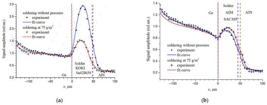 Amplitude of the PBD signal across the solder joint between the Ge wafer and the AlN ceramics: (a) solder KOKI; (b) solder AIM. Dash lines are solder layer boundaries. Adapted with permission from [75]. Copyright (2022), Ioffe Institute.