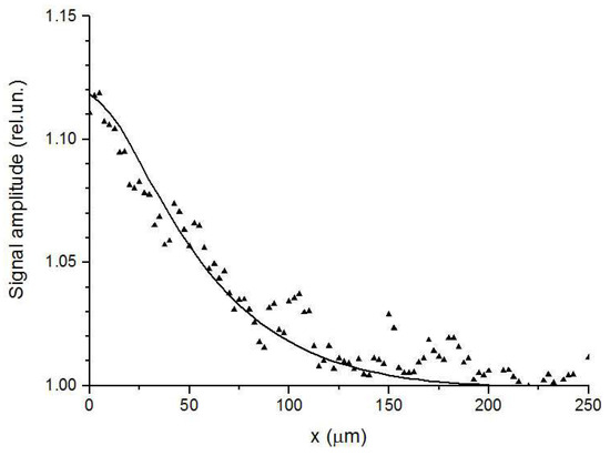 The PBD signal amplitude versus the distance from the Si–Al interface. Triangles are for the experimental data for the sample with the joint thickness of 15 μm bonded under the pressure of 5.5 kPa. The solid curve corresponds to the fitted thermal resistance 2.5 × 10−7 m2K/W. Adapted with permission from [58]. Copyright (2018), Elsevier.