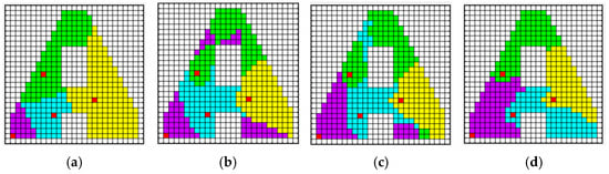 The result of sub-region assignment during the iteration. In the figure, the red grid represents the initial position of each agent, the white grid represents unexplored areas, and the other different colored grid domains represent the sub-regions of the target region. (a) Iteration = 0, (b) iteration = 160, (c) iteration = 320, (d) iteration = 480.