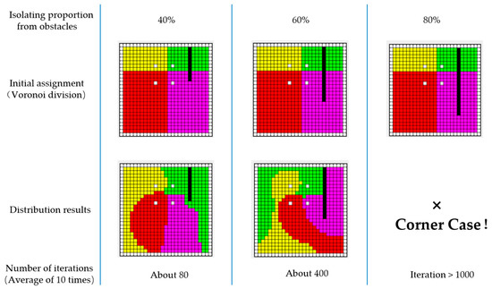 As shown in Figure 4, when the proportion of isolation is relatively small (40%), the non-connected sub-regions (green) on both sides of the obstacle can quickly connect through the iteration Equation (15), thus converging to the goal defined in Definition 2. With the increase in the isolating proportion, the two non-connected regions become more difficult to connect. However, the process of global balanced assignment can be achieved by continuously expanding the set while reducing the set to the empty set through the reward and penalty of matrix . This process obviously has a greater number of iterations. Nevertheless, when the proportion of obstacle isolation increases to a certain extent, it becomes difficult to iterate to an effective solution.