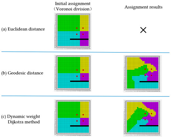 For the agent , the corresponding distance matrix records the travel cost of each cell in . The assignment matrix , which records the relationship between the grid and the agents, is obtained by combining distance matrices. During the construction process of , each element is calculated by the following formula: