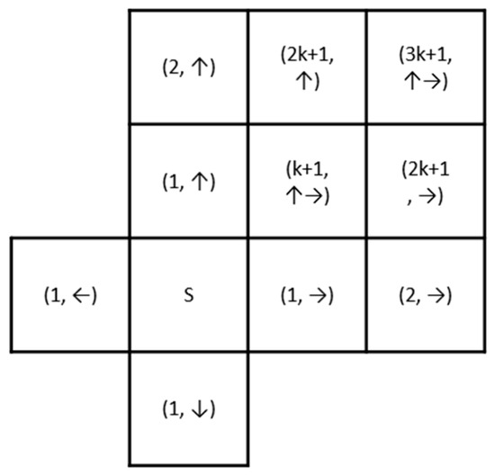However, it is noteworthy that, unlike the Dijkstra algorithm, which searches based on known global cost, this paper assigns weights to the path cost dynamically and locally. As shown in Figure 6, at each step of the grid search, the source direction from the “parent node” to the current node is recorded. When the search direction changes, a path cost less than 1 is assigned to suppress the horizontal and vertical expansion from the source node “”. The range of the path cost “” for turning should be within the range of Manhattan distance and Euclidean distance, i.e.,.