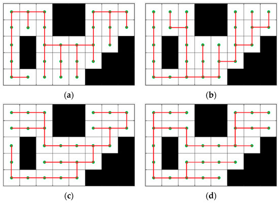 The focus of many studies on the mCPP problem has been on the task partitioning, while a simple “Z” pattern of coverage path is adopted for the decomposed units. Li [31] and Torres [32] present methods to optimize the scanning direction instead of using a fixed direction for all units, which can minimize the number of unit traversals and turns on the coverage paths. However, it comes at the cost of an increase in computational complexity when solving for the optimal path of the connected graph. The X-STC algorithm based on spanning tree, proposed by Guruprasad [33], divides the workspace into non-overlapping units and generates a path around the spanning tree, which ensures that every point in the grid is covered exactly once. This circular path has the advantage of avoiding redundant motion.