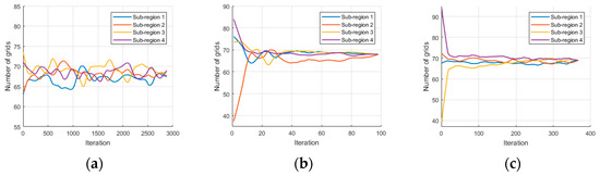Figure 10a shows the result of the original algorithm, and it can be observed that after 2900 iterations, the balance condition for subregion assignment was not yet satisfied. The original algorithm fails in complex indoor environments with many obstacles and large wall separations. Figure 10b presents the iteration process using geodesic distance, and it can be seen that the balance condition is satisfied after the 97th iteration, achieving convergence very fast. Figure 10c shows the iteration process with shape optimization added, which converged after 367 iterations. Specific evaluation metrics and their improvement effects will be further analyzed in the following sections.