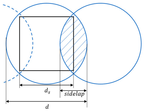 In practical applications, the detection range of sensors carried by the agents is typically circular, with a coverage diameter of . As shown in Figure 12, there is overlap of information in the sensing range of adjacent path nodes, where the overlap length is referred to as . Considering the overlapping of adjacent sensors, the overlap percentage p is defined as:
