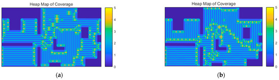 Considering the sensing redundancy of each cell, there should be . That is, the sensing diameter should be greater than the diagonal length of the cell formed by the scanning density . The generated coverage paths are simulated by selecting , i.e.,. Considering the number of scans performed at various locations within the region, the coverage heatmap of the target area is shown in Figure 13.