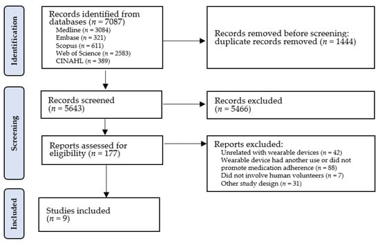 A total of 7087 records were identified in the databases consulted, from which 1444 duplicates were removed, giving a total of 5643 studies for title and abstract screening. This initial screening led to the exclusion of a further 5466 studies that failed to meet the eligibility criteria. After reading the full texts of the remaining 177 eligible studies, 161 were subsequently excluded for not meeting the eligibility criteria, leaving a total of 9 studies for inclusion in the review. The flow diagram in Figure 1 illustrates the study selection process.