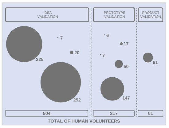 Figure 2 illustrates the number of human volunteers involved in each validation step: idea (n = 504), prototype (n = 217), and product (n = 61), totaling 782 participants.