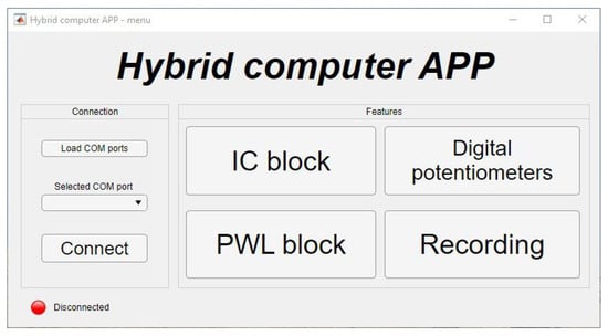 The presented hybrid computer, in addition to the previously mentioned digital potentiometers realizing the so-called counting potentiometers, contains other digital components, such as an IC block, PWL block, and ADCs for monitoring the outputs of integrators (state variables). All digital components are controlled by the main processor ATMEGA64 of the hybrid computer, and can be achieved in two ways. By default, the digital parts can be controlled from an integrated keyboard, while information about the current state of each block is displayed on an integrated OLED display. Another option is to provide control by commands via a personal computer. In order to simplify and improve the work with the command-based system, an appropriate desktop application (graphical user interface), see Figure 3 was created in the interactive development environment App Designer (https://www.mathworks.com/products/matlab/app-designer.html) (accessed on 27 February 2023) which is available in the MATLAB program environment.