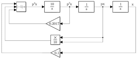 From the point of view of the used hybrid computer, the advantage of this system is the absence of the steps mentioned in points 3 and 4 (see Section 4), which are usually a part of the preprocessing. The presented hybrid computer has a time constant of 1,s in its integrators and the system is fast enough; hence, it is not necessary to resort to time transformation. Moreover, the maximum values of the state variable in all its derivatives are comparable to the machine unit of 10 V, and therefore normalization is not required. For the presented computer, the appropriate method is to use the method of decreasing the order of the derivative. This method involves the use of integrators connected in a cascade. Feedback with different transfers is used to return the state variables from the outputs of the integrators to the beginning of the cascade, where a “summator” is usually placed and goes to the first integrator of the cascade. To apply the method of decreasing the order of the derivative, it is convenient to adapt the differential equation into a system of differential equations that express the individual state variables:
