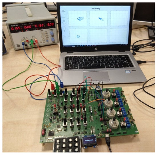 The hybrid analog computer presented in this paper can be directly used for the synthesis of chaotic circuits based on the Sprott case N, H, and M systems. Therefore, it can serve as a core for a chaos-based sensing system, as described in [54]. Another example of the application of a versatile analog computer is in the construction of a driven chaotic system, which is able to significantly improve the range of a metal detector, as suggested in [55]. The DC signal sensor activated by noise is proposed in [56]. It directly utilizes Chua’s circuit, i.e., the third-order autonomous chaotic circuit with a three-segment piecewise-linear resistor. This system can be easily transformed into a flow-equivalent network based on the integrator block schematic [57]. Moreover, individual parameters of this form of Chua’s oscillator can be tuned by a simple act of the user, and such a change can increase the performance of the sensing system. Versatility (without unnecessary complexity), along with saved construction time, are the main advantages of the proposed hybrid computer.