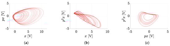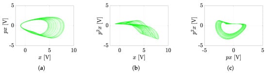 The modified program scheme (see Figure 5) can already be connected directly to the presented hybrid computer (see Figure 6). The simulation results on the hybrid computer, as well as the results obtained by numerical integration using MATLAB, are the attractors of the state variables, i.e., the attractors of the individual derivative (see Figure 7). The measured waveforms of the attractors in all available projections are shown in Figure 8. They were recorded at a low sampling rate of 10 Hz because it is a slow signal and the programming scheme assumed a low time constant of 1 s. When comparing the measured waveforms with the numerical ones (see Figure 7), only slight differences can be seen, especially in the behavior of the attractor in the plane. The observed deformation is mainly due to the low-impedance decoupling found after the computer design. However, despite this shortcoming, the waveforms obtained from the measurement and numerical analysis are very similar, especially in the plane. The generated attractor remains structurally stable even when slightly deformed.