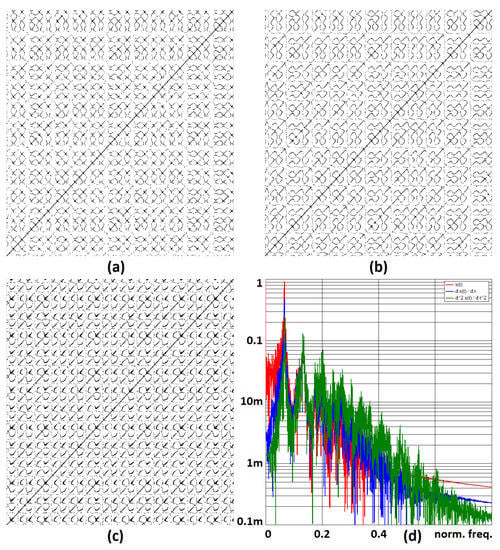 Recurrence plot for the measured chaotic waveform: (a) , (b) , and (c) . Subplot (d) gives the normalized frequency spectrum of the measured waveforms.