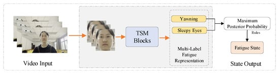 Our model monitors the two facial representation subsets: the eye state representation and the mouth state representation. In each representation set, we distinguish the anomaly representation from the normal representation with a spatial–temporal feature extraction network constructed with temporal shift module (TSM) [] blocks. The extracted fatigue representations of both subsets are later fused with a naive Bayesian model to predict the overall fatigue state.