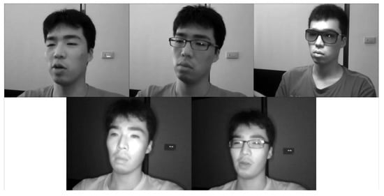 Frame samples of five scenarios in the NTHU-DDD dataset. The images in the first row are sample frames taken in daylight, and from left to right are the no-glasses, glasses, and sunglasses scenarios, respectively. The images in the second row are sample frames taken at nighttime.
