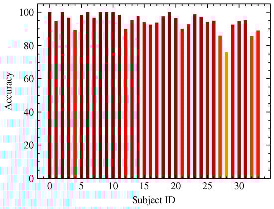 The subset detection accuracy of all subjects in the OSFM dataset. The horizontal axis is the subject ID in the OSFM dataset and the vertical axis is the frame-wise fatigue state accuracy of the subjects.