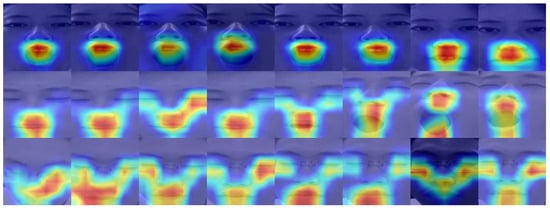 As mentioned above, our model was trained on the NTHU-DDD dataset and tested on the OSFM dataset without fine-tuning. The experimental results supported our claim of the high robustness of the proposed model. The robustness of the proposed model was gained from both the rich variance of the training dataset and the structural similarity of the human face. We summarized the subset detection accuracy of all subjects in the OSFM dataset. As exhibited in Figure 5, where the darker color denotes higher accuracy, the model’s performance varied over the subjects but held a high detection accuracy towards most subjects, which indicated that our method achieved an excellent overall performance. We visualized the gradient class activation heat map (Grad-CAM) [] of our backbone model for samples of eye anomalies, mouth anomalies, and eye-head anomalies. As exhibited in Figure 6, the feature backbone was highly sensitive to mouth region anomalies and could effectively deal with scenarios with facial decorations, such as glasses.