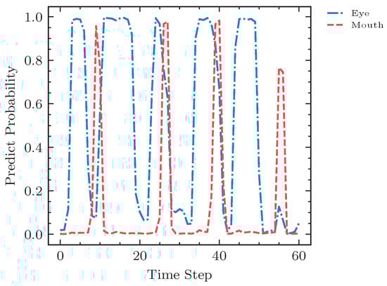 The factor analysis of the video sample from subject 005. The red and orange curves represent the predicted mouth and eye anomaly probabilities, respectively. The time–serial curves show the prediction results over time for a series of fatigue behaviors on the test video sample.