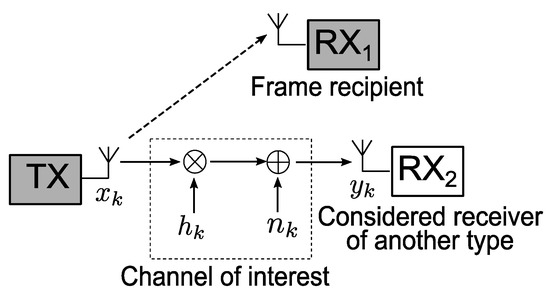 In the current paper, a heterogeneous network is considered, in which conventional BICM and LABRID-compatible BICM-ID stations coexist. The transmission is carried out between stations of the same type, but the signal may also reach one or more stations of the other type where it should be rejected. We study the receiver’s ability to reject the frame that is not destined for it. Therefore, as illustrated in Figure 1, we are interested in the channel between the transmitter of one type (TX) and the receiver of the other type (RX2) instead of the link between the stations of the same type (TX and RX1). The uncorrelated Rayleigh fading channel model is assumed; the sample received in the kth modulation period can be represented as