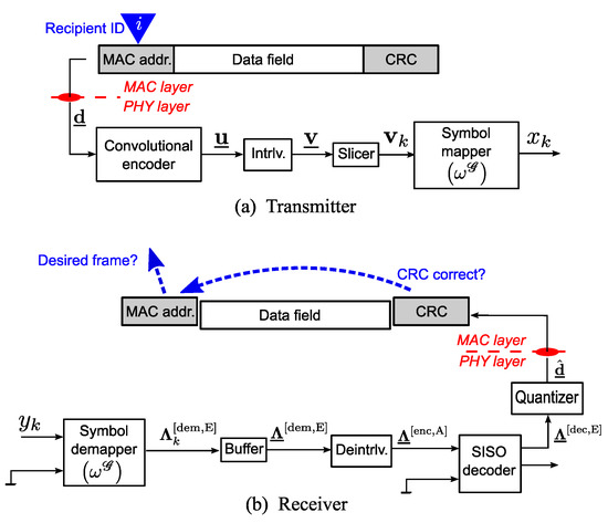 The SISO decoder runs just one time per data frame; it outputs the LLRs related to the data frame, denoted as , which are passed through the quantizer. The vector of hard decisions, , reaches the MAC layer. In the case of the conventional BICM receiver, every frame must be transferred to the MAC layer, where the CRC checksum is verified; finally, the destination of the frame can be derived from its MAC address. It is expected that if a foreign frame of the LABRID-type is received by the conventional BICM receiver, the CRC verification failure appears and, consequently, the frame is rejected without reading the destination MAC address.
