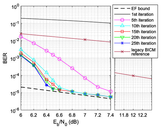 Let us look at the BER vs. plot shown in Figure 4. The turbo-cliff, or waterfall (i.e., the region where the real BER curves start to decline rapidly to reach error-free feedback (EF) bound [5]), is quite flat, which is typical when relatively short data frames are assumed [18]. Our target BER is below a reasonable level, which is reached at if all 25 iterations are executed, or for after only 15 iterations. When compared with the first iteration line, the performance of the LABRID receiver is tremendous.