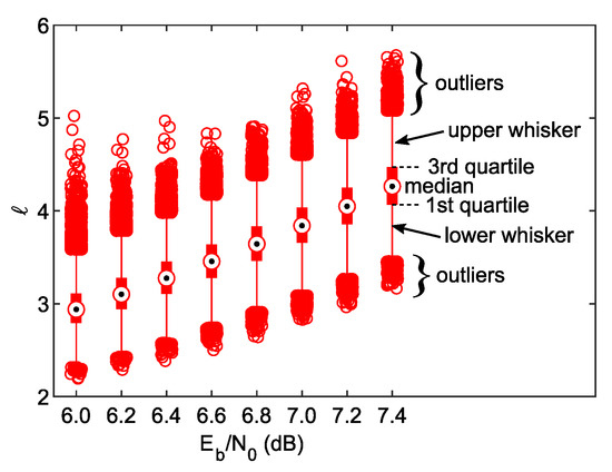 Figure 5 shows the statistics of ℓ in the 25th iteration as a box plot [19]. This allows for easy identification of the median, the 1st and 3rd quartiles, as well as the range where almost all entries appear. The upper whisker ends at the value , and the lower whisker’s lower end is at , where and are the 1st and 3rd quartiles, respectively. For the Gaussian random variable distribution (in the considered case, the ℓ samples hold that feature under the central limit theorem) this gives coverage of ca. 99.3% of entries. Circles represent outliers, which exceed the range limited by the whiskers. To ensure statistical reliability, a large number of ℓ samples () have been collected for each point.