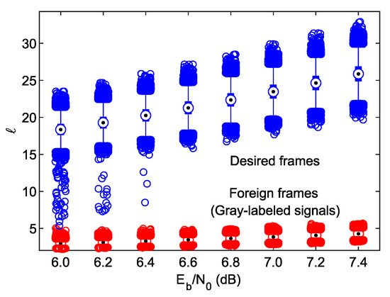 In Figure 7, the l distributions observed in the 15th and 10th iterations are shown in the respective subplots. From the figure, it is evident that making the decision in iteration 15 poses a problem if is below 7.0 dB, i.e., at the minimal distance between the outliers of different types is much shorter than in Figure 6, and for any smaller they overlap each other, which leads to frame-filtering errors. In iteration 10, the situation is even worse—the outliers of different types are close to each other at , and they start to overlap at . The good news is that the ℓ distributions of the BICM foreign frames are almost identical, regardless of the considered iteration number, which proves that the iterative decoding process does not converge. In addition, judging by the whisker length, there is just a small number of desired BICM-ID frames exhibiting a low ℓ value. Based on these facts, an energy-preserving solution can be proposed as follows. In every iteration, we compare the calculated ℓ value against a relatively high threshold value (e.g., 8.0). If , the frame can be safely classified as desired and no further comparison is necessary. If not, the decision regarding the frame destination and type is postponed to the next iteration, and so on.