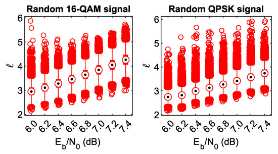 As expected, the iterative decoding process does not converge, which is reflected in poor ℓ statistics across the considered range. An important observation is that the distributions of l values at individual points for the random 16-QAM signal are very similar to their counterparts from Figure 5 (observe the median evolution from ca. 2.9 at up to ca. 4.2 for ). Thus, for the LABRID BICM-ID receiver, the Gray-labeled BICM signal, representing a valid codeword, means nothing more than the fully random 16-QAM signal and can be rejected with equal ease.