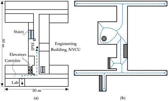 The test environment was Engineering Building V, an I-shape building with two wings and a connection section, in the Guang-Fu Campus of the NYCU. The experiment was performed on the fifth floor with a floor area of around 5000 m2; the top view is shown in Figure 9b. The wall material is made from concrete and white fiber cement layered onto the wall surface with a solar reflectance of 0.40. In the lab, there is a dome screen made of wood, which occupies one-quarter of the lab space. There is also a mirror on the wall adjacent to the door which can produce fake feature data by reflecting the laser light.