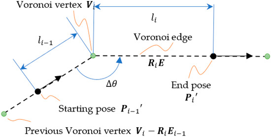 As shown in Figure 4b, one limitation, called the turn-in point limit, on the distance for the IMR between the pose of and the Voronoi vertex making a simple turn to approach the subsequent pose can be derived as follows: